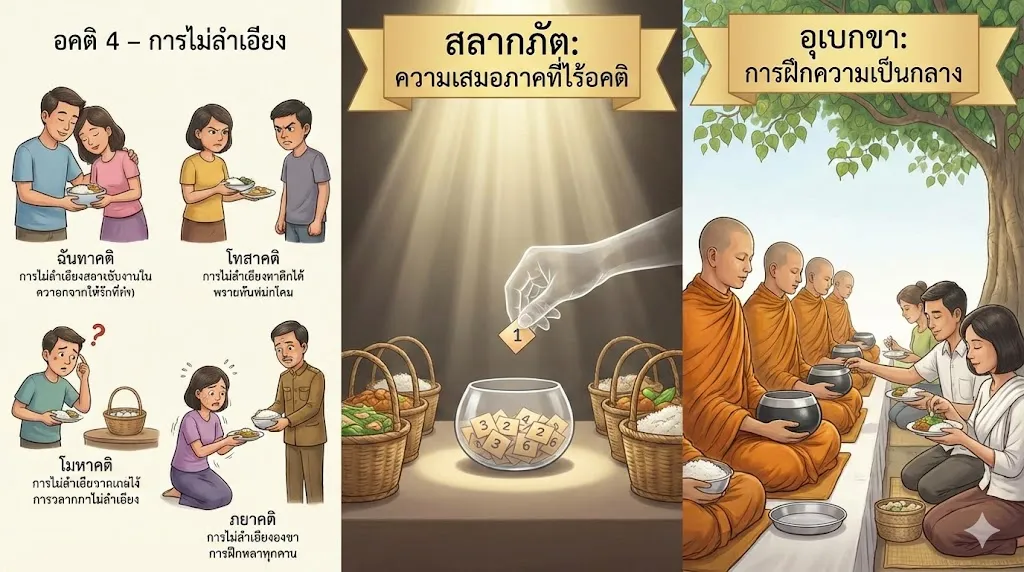 การทำสลากภัตช่วยลดอคติทั้งสี่อย่างโดยตรง เพราะเจ้าภาพไม่สามารถเลือกผู้รับเอง การใช้การจับสลากทำให้การถวายเป็นไปอย่างเสมอภาค ไม่ขึ้นกับความสนิท ความชอบ หรือความเกรงใจ