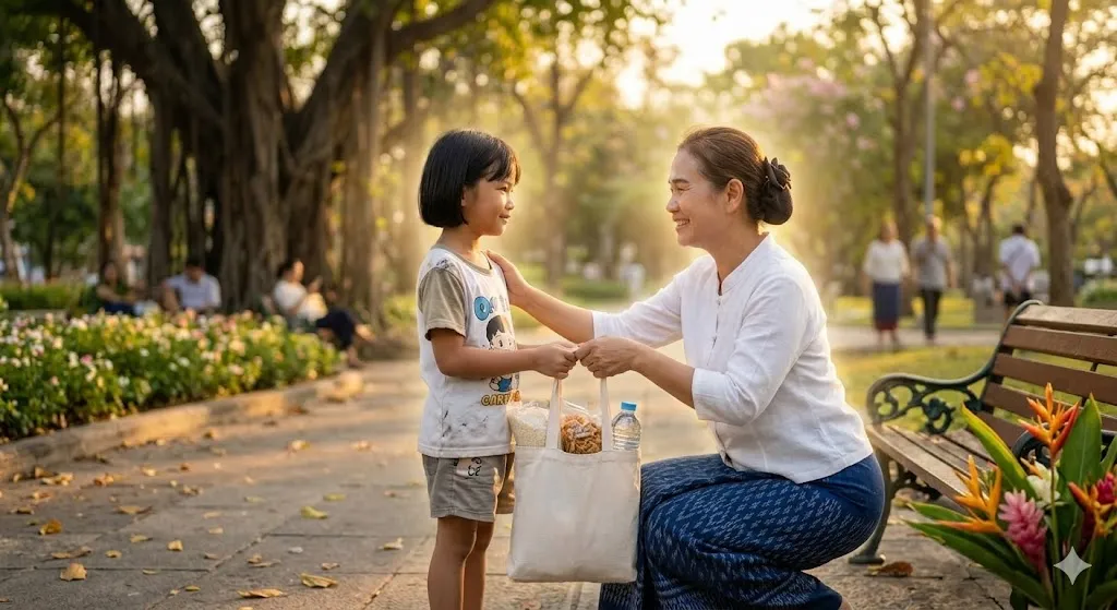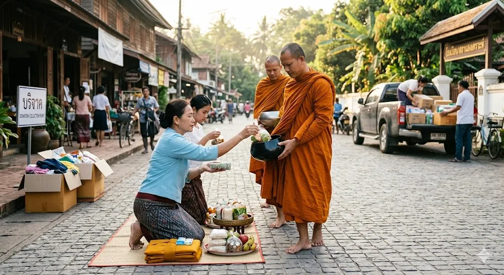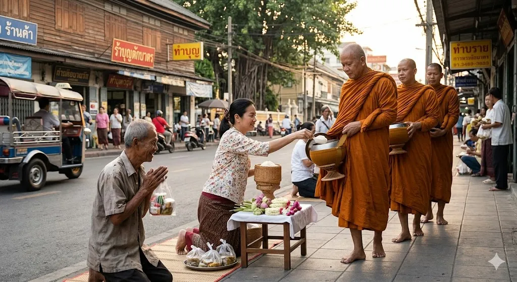 ตัวอย่างเช่น บางคนเริ่มต้นวันด้วยการ ทำบุญตักบาตร ก่อนออกไปทำงาน เพราะเชื่อว่าจะช่วยให้วันนั้นผ่านไปอย่างราบรื่นและจิตใจสงบ หรือบางครอบครัวอาจร่วมกัน บริจาคสิ่งของให้โรงพยาบาลหรือสถานสงเคราะห์ เพื่อช่วยเหลือผู้ที่ขาดโอกาส นอกจากนี้ การแบ่งปันอาหารให้เพื่อนบ้านหรือช่วยเหลือผู้ที่กำลังลำบากก็ถือเป็นการให้ทานในชีวิตประจำวันเช่นกัน